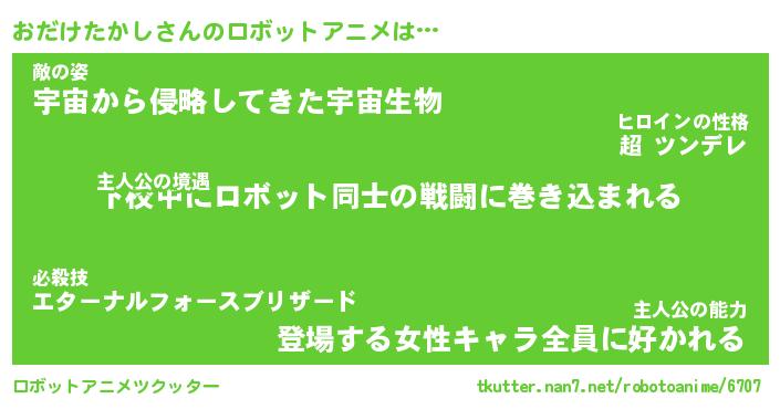おだけたかしさんのロボットアニメは… 主人公の境遇『下校中にロボット同士の戦闘に巻き込まれる』敵の姿『宇宙から侵略してきた宇宙生物』主人公の能力『登場する女性キャラ全員に好かれる』 ツクッター #ロボットアニメツクッター http://tkutter.nan7.net/robotoanime/6707/