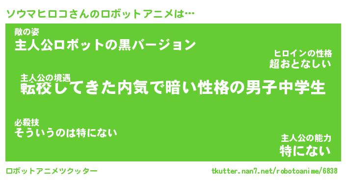 ソウマヒロコさんのロボットアニメは… 主人公の境遇『転校してきた内気で暗い性格の男子中学生』敵の姿『主人公ロボットの黒バージョン』主人公の能力『特にない』 ツクッター #ロボットアニメツクッター http://tkutter.nan7.net/robotoanime/6838/