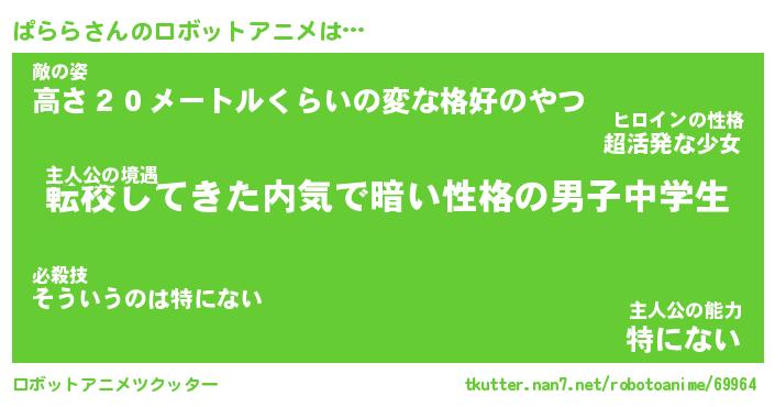 ぱららさんのロボットアニメは… 主人公の境遇『転校してきた内気で暗い性格の男子中学生』敵の姿『高さ20メートルくらいの変な格好のやつ』主人公の能力『特にない』 ツクッター #ロボットアニメツクッター http://tkutter.nan7.net/robotoanime/69964/