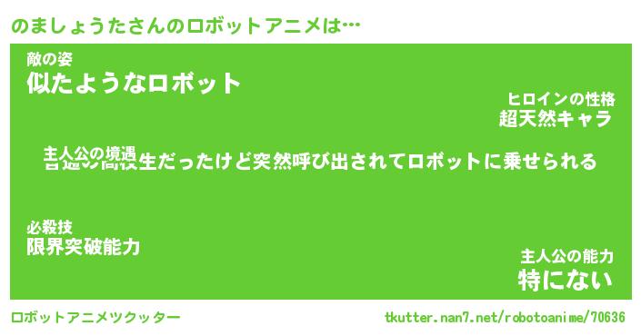 のましょうたさんのロボットアニメは… 主人公の境遇『普通の高校生だったけど突然呼び出されてロボットに乗せられる』敵の姿『似たようなロボット』主人公の能力『特にない』 ツクッター #ロボットアニメツクッター http://tkutter.nan7.net/robotoanime/70636/