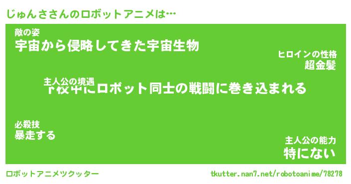 じゅんささんのロボットアニメは… 主人公の境遇『下校中にロボット同士の戦闘に巻き込まれる』敵の姿『宇宙から侵略してきた宇宙生物』主人公の能力『特にない』 ツクッター #ロボットアニメツクッター http://tkutter.nan7.net/robotoanime/78278/