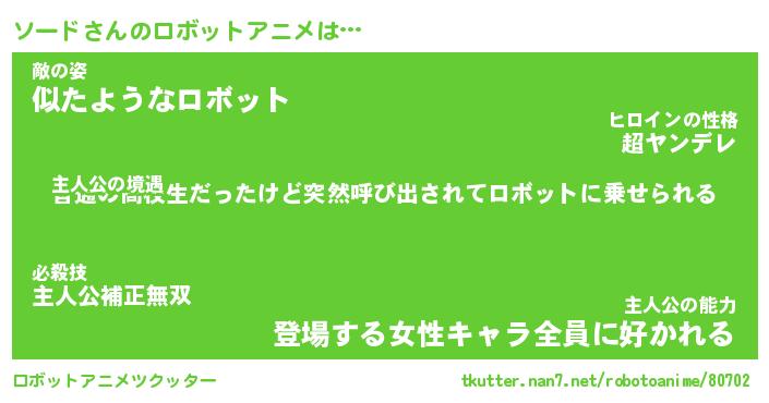 ソードさんのロボットアニメは… 主人公の境遇『普通の高校生だったけど突然呼び出されてロボットに乗せられる』敵の姿『似たようなロボット』主人公の能力『登場する女性キャラ全員に好かれる』 ツクッター #ロボットアニメツクッター http://tkutter.nan7.net/robotoanime/80702/