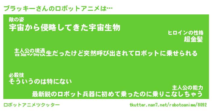 ブラッキーさんのロボットアニメは… 主人公の境遇『普通の高校生だったけど突然呼び出されてロボットに乗せられる』敵の姿『宇宙から侵略してきた宇宙生物』主人公の能力『最新鋭のロボット兵器に初めて乗ったのに乗りこなしちゃう』 ツクッター #ロボットアニメツクッター http://tkutter.nan7.net/robotoanime/8092/