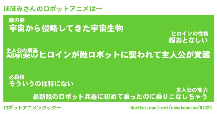 ほほみさんのロボットアニメは… 主人公の境遇『幼馴染のヒロインが敵ロボットに襲われて主人公が覚醒』敵の姿『宇宙から侵略してきた宇宙生物』主人公の能力『最新鋭のロボット兵器に初めて乗ったのに乗りこなしちゃう』 ツクッター #ロボットアニメツクッター http://tkutter.nan7.net/robotoanime/81020/