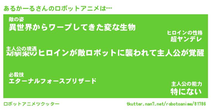 あるかーるさんのロボットアニメは… 主人公の境遇『幼馴染のヒロインが敵ロボットに襲われて主人公が覚醒』敵の姿『異世界からワープしてきた変な生物』主人公の能力『特にない』 ツクッター #ロボットアニメツクッター http://tkutter.nan7.net/robotoanime/81786/