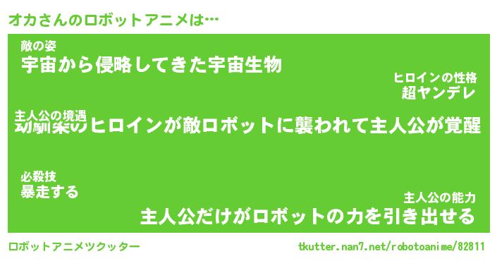 オカさんのロボットアニメは… 主人公の境遇『幼馴染のヒロインが敵ロボットに襲われて主人公が覚醒』敵の姿『宇宙から侵略してきた宇宙生物』主人公の能力『主人公だけがロボットの力を引き出せる』 ツクッター #ロボットアニメツクッター http://tkutter.nan7.net/robotoanime/82811/