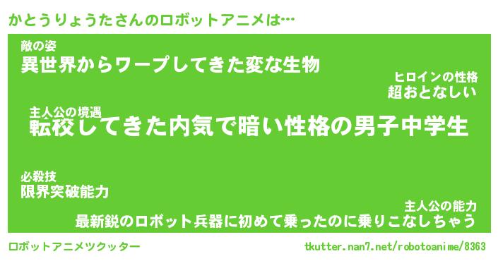 かとうりょうたさんのロボットアニメは… 主人公の境遇『転校してきた内気で暗い性格の男子中学生』敵の姿『異世界からワープしてきた変な生物』主人公の能力『最新鋭のロボット兵器に初めて乗ったのに乗りこなしちゃう』 ツクッター #ロボットアニメツクッター http://tkutter.nan7.net/robotoanime/8363/