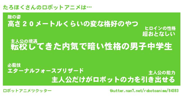 たろほくさんのロボットアニメは… 主人公の境遇『転校してきた内気で暗い性格の男子中学生』敵の姿『高さ20メートルくらいの変な格好のやつ』主人公の能力『主人公だけがロボットの力を引き出せる』 ツクッター #ロボットアニメツクッター http://tkutter.nan7.net/robotoanime/84383/