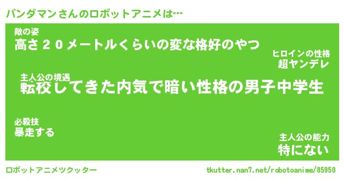 パンダマンさんのロボットアニメは… 主人公の境遇『転校してきた内気で暗い性格の男子中学生』敵の姿『高さ20メートルくらいの変な格好のやつ』主人公の能力『特にない』 ツクッター #ロボットアニメツクッター http://tkutter.nan7.net/robotoanime/85950/
