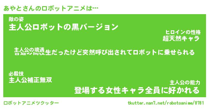 あやとさんのロボットアニメは… 主人公の境遇『普通の高校生だったけど突然呼び出されてロボットに乗せられる』敵の姿『主人公ロボットの黒バージョン』主人公の能力『登場する女性キャラ全員に好かれる』 ツクッター #ロボットアニメツクッター http://tkutter.nan7.net/robotoanime/8781/