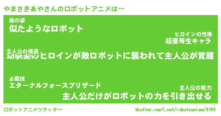 やまさきあやさんのロボットアニメは… 主人公の境遇『幼馴染のヒロインが敵ロボットに襲われて主人公が覚醒』敵の姿『似たようなロボット』主人公の能力『主人公だけがロボットの力を引き出せる』 ツクッター #ロボットアニメツクッター http://tkutter.nan7.net/robotoanime/9169/