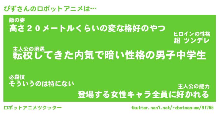 ぴずさんのロボットアニメは… 主人公の境遇『転校してきた内気で暗い性格の男子中学生』敵の姿『高さ20メートルくらいの変な格好のやつ』主人公の能力『登場する女性キャラ全員に好かれる』 ツクッター #ロボットアニメツクッター http://tkutter.nan7.net/robotoanime/91765/