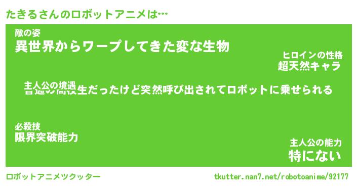 たきるさんのロボットアニメは… 主人公の境遇『普通の高校生だったけど突然呼び出されてロボットに乗せられる』敵の姿『異世界からワープしてきた変な生物』主人公の能力『特にない』 ツクッター #ロボットアニメツクッター http://tkutter.nan7.net/robotoanime/92177/