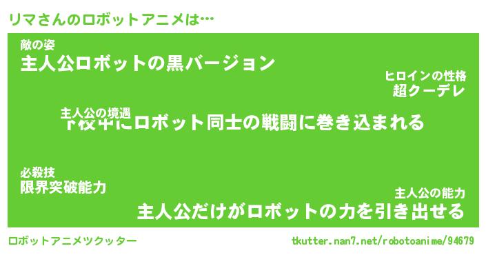 リマさんのロボットアニメは… 主人公の境遇『下校中にロボット同士の戦闘に巻き込まれる』敵の姿『主人公ロボットの黒バージョン』主人公の能力『主人公だけがロボットの力を引き出せる』 ツクッター #ロボットアニメツクッター http://tkutter.nan7.net/robotoanime/94679/