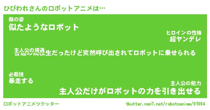 ひびわれさんのロボットアニメは… 主人公の境遇『普通の高校生だったけど突然呼び出されてロボットに乗せられる』敵の姿『似たようなロボット』主人公の能力『主人公だけがロボットの力を引き出せる』 ツクッター #ロボットアニメツクッター http://tkutter.nan7.net/robotoanime/97094/