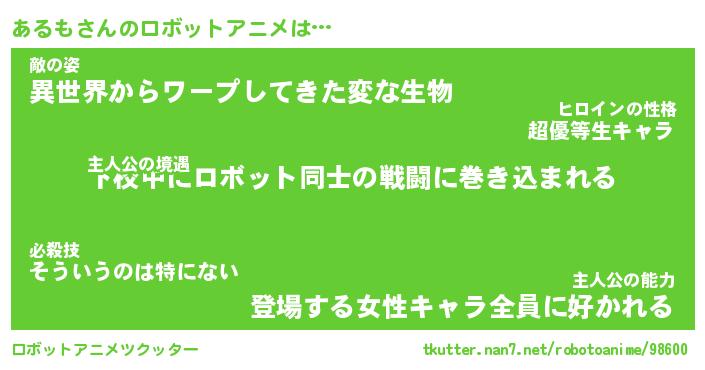 あるもさんのロボットアニメは… 主人公の境遇『下校中にロボット同士の戦闘に巻き込まれる』敵の姿『異世界からワープしてきた変な生物』主人公の能力『登場する女性キャラ全員に好かれる』 ツクッター #ロボットアニメツクッター http://tkutter.nan7.net/robotoanime/98600/