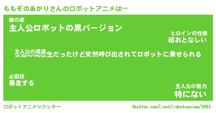 ももぞのあかりさんのロボットアニメは… 主人公の境遇『普通の高校生だったけど突然呼び出されてロボットに乗せられる』敵の姿『主人公ロボットの黒バージョン』主人公の能力『特にない』 ツクッター #ロボットアニメツクッター http://tkutter.nan7.net/robotoanime/9893/