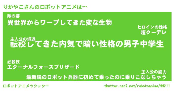 りかやこさんのロボットアニメは… 主人公の境遇『転校してきた内気で暗い性格の男子中学生』敵の姿『異世界からワープしてきた変な生物』主人公の能力『最新鋭のロボット兵器に初めて乗ったのに乗りこなしちゃう』 ツクッター #ロボットアニメツクッター http://tkutter.nan7.net/robotoanime/99211/