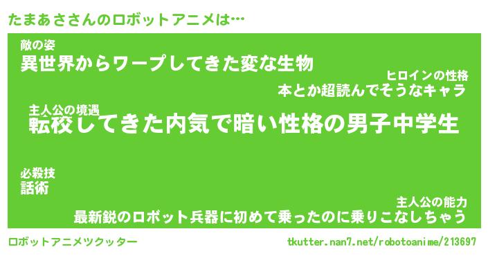 たまあささんのロボットアニメは… 主人公の境遇『転校してきた内気で暗い性格の男子中学生』敵の姿『異世界からワープしてきた変な生物』主人公の能力『最新鋭のロボット兵器に初めて乗ったのに乗りこなしちゃう』 ツクッター #ロボットアニメツクッター http://tkutter.nan7.net/robotoanime/213697/