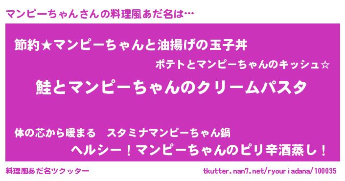 | 女子向けラノベタイトル風あだ名 | 『死神マンピーちゃんの再婚』 |
