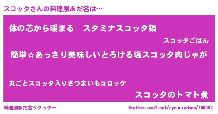 | ヒーロー風カッコイイあだ名 | 『ネオスコッタ』『ウルトラスコッタマン』 |