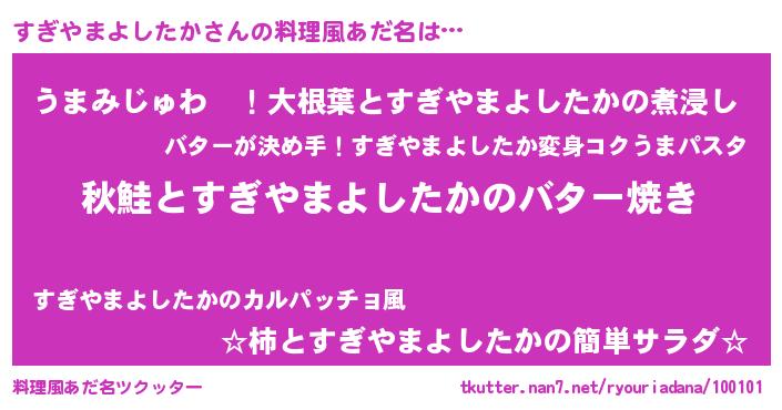 | 胡散臭い通販商品みたいなあだ名 | 『来世でも幸せになれる水素水…その名も「すぎやまよしたか」』 |