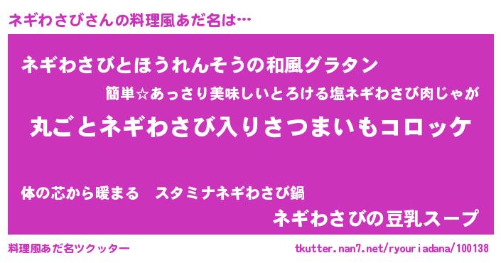 | 女子向けラノベタイトル風あだ名 | 『乙女ゲームの破滅フラグしかない悪役ネギわさびに転生してしまった…』 |