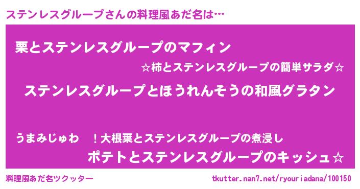 | 男性向けラノベタイトル風あだ名 | 『ステンレスグループ~年齢イコール彼女いない歴の魔法使い~』 |