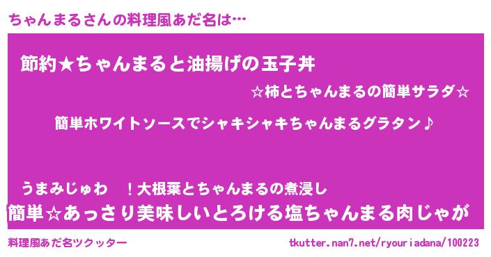 | 男性向けラノベタイトル風あだ名 | 『ちゃんまるの嫁は女の子じゃないと思った?』 |