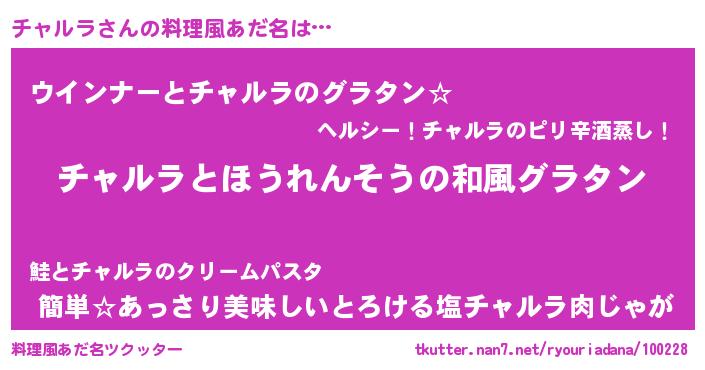| 男性向けラノベタイトル風あだ名 | 『転生したらチャルラだった件』 |