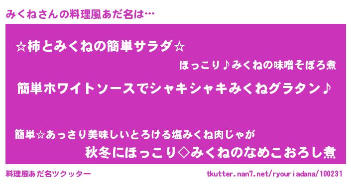 | 男性向けラノベタイトル風あだ名 | 『みくねの嫁は女の子じゃないと思った?』 |