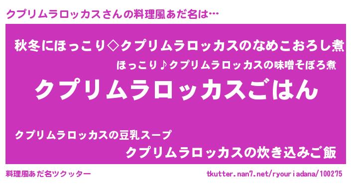 | 男性向けラノベタイトル風あだ名 | 『クプリムラロッカススレイヤー』 |