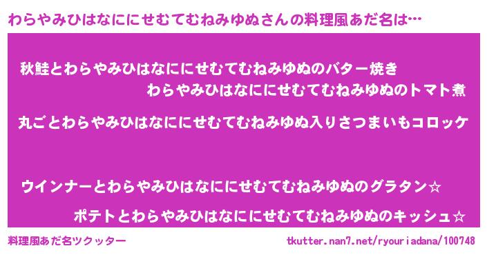 | 男性向けラノベタイトル風あだ名 | 『この素晴らしい世界にわらやみひはなににせむてむねみゆぬを!』 |