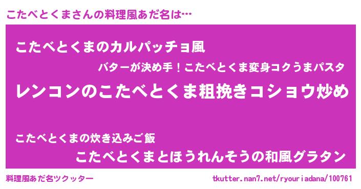 | 女子向けラノベタイトル風あだ名 | 『こたべとくまなんてお断りですっ。』 |