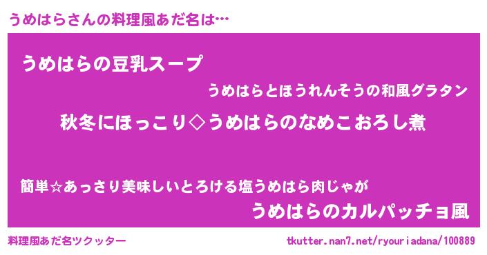 | 男性向けラノベタイトル風あだ名 | 『うめはらに滅ぼされるだけの簡単なお仕事です』 |