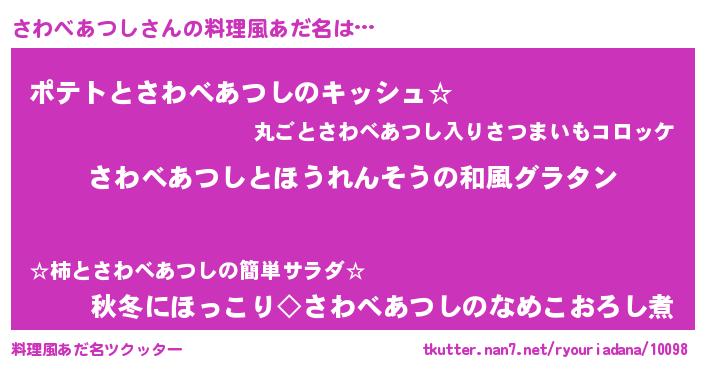 | 男性向けラノベタイトル風あだ名 | 『さわべあつし~年齢イコール彼女いない歴の魔法使い~』 |