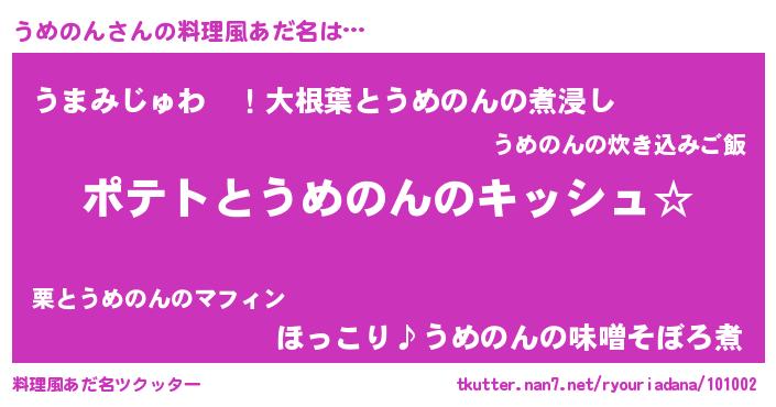 | 男性向けラノベタイトル風あだ名 | 『うめのんの嫁は女の子じゃないと思った?』 |