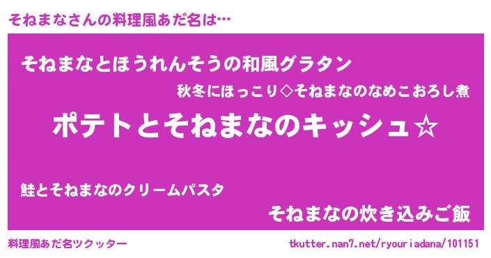 | 女子向けラノベタイトル風あだ名 | 『そねまなの卵を拾いまして』 |