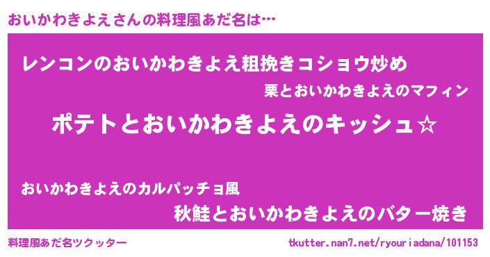 | 男性向けラノベタイトル風あだ名 | 『おいかわきよえの嫁は女の子じゃないと思った?』 |