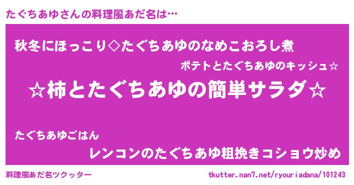 | 意味不明あだ名 | 『自称たぐちあゆ』『ペロリンたぐちあゆ』 |