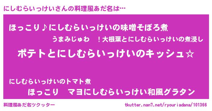 | 女子向けラノベタイトル風あだ名 | 『にしむらいっけいの卵を拾いまして』 |