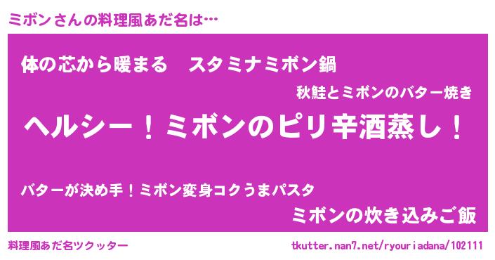 | 男性向けラノベタイトル風あだ名 | 『Re:ミボンから始める異世界生活』 |