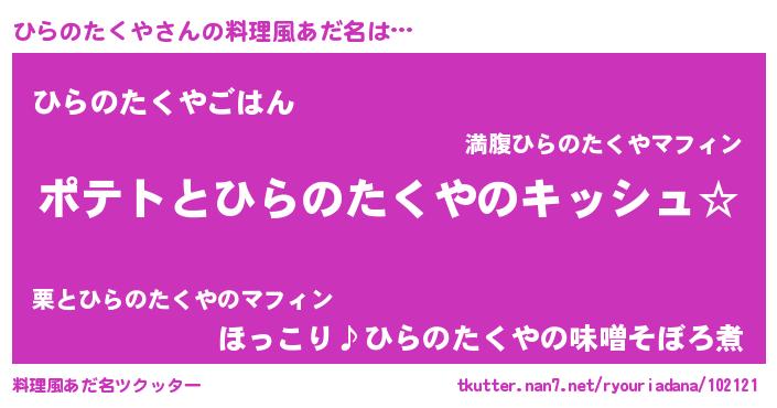 | 男性向けラノベタイトル風あだ名 | 『ひらのたくやの嫁は女の子じゃないと思った?』 |
