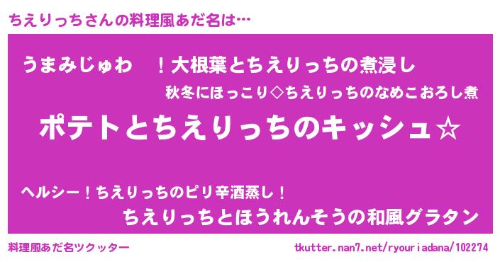 | 女子向けラノベタイトル風あだ名 | 『ちえりっちの卵を拾いまして』 |