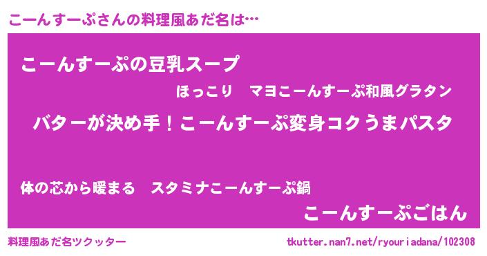 | 女子向けラノベタイトル風あだ名 | 『こーんすーぷ恋絵巻』 |
