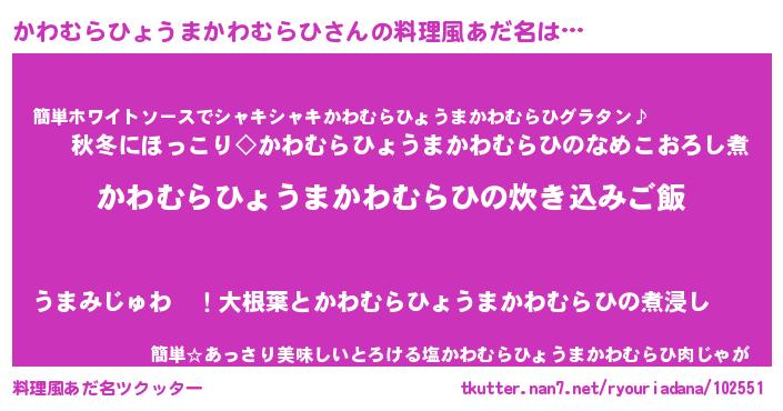 | 男性向けラノベタイトル風あだ名 | 『うちのかわむらひょうまかわむらひが世界を掌握している!』 |