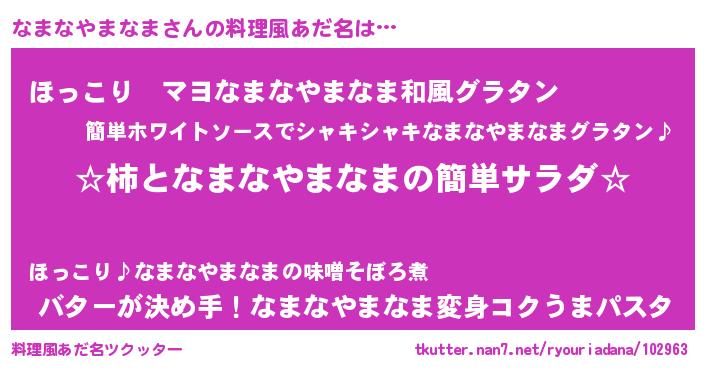 | ピコ太郎風あだ名 | 『ナナ太郎』『ナマ二郎』『ナコ史郎』 |