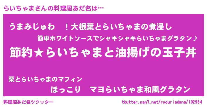 | ヘコむあだ名 | 『らいにー』『酢こんぶ』『らいお』 |