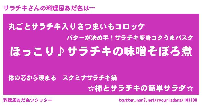 | 男性向けラノベタイトル風あだ名 | 『サラチキの憂鬱』『緋弾のサラチキ』 |