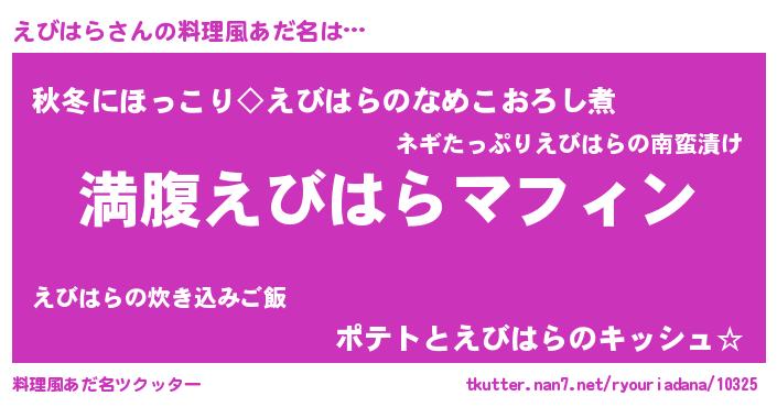 | 胡散臭い通販商品みたいなあだ名 | 『絶対に幸福をもたらす水素水…その名も「えびはら」』 |